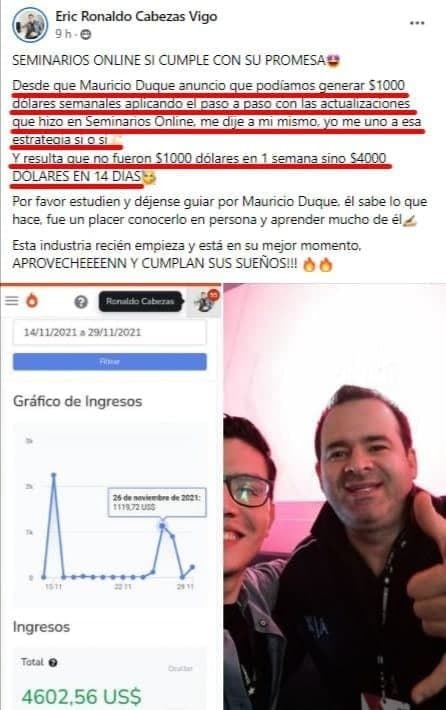 Eric Ronaldo ya esta generando $4.000 Dólares en 14 días y Lissie Franco ya logro sus primeros $3.398 Dólares en 15 días. Dos personas que ingresaron a Seminarios Online sin tener conocimiento o experiencia y ya hoy están obteniendo resultados.
